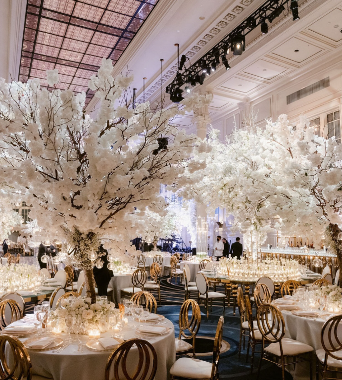 The towering white floral trees, sparkling candlelit tables, and elegant gold accents create a magical snowy forest indoors.