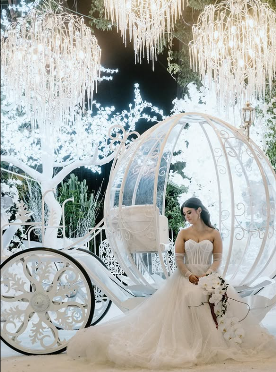 This breathtaking scene captures a bride in a dreamy white gown sitting beside a magical carriage under sparkling chandeliers.