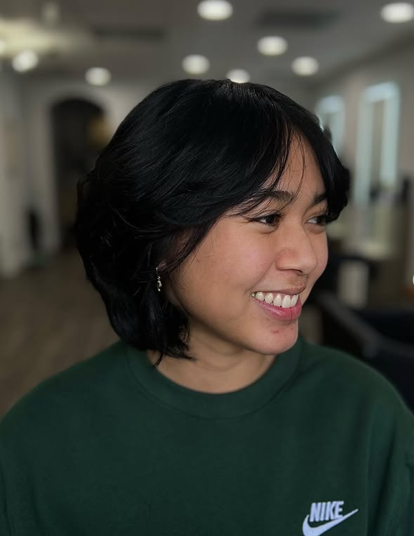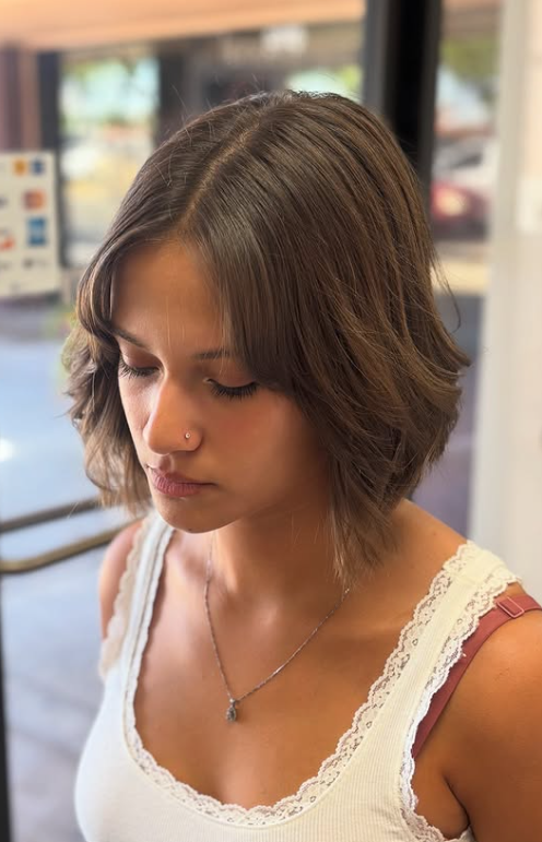 The side part enhances the natural volume, making it a flattering and modern choice for anyone looking for a chic short layered hairstyle.