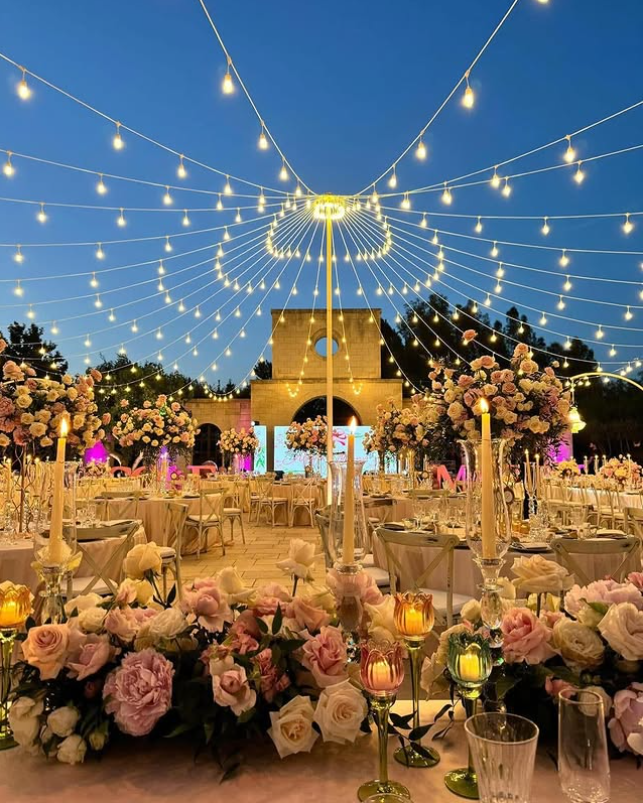 This breathtaking setup features an open-air wedding reception illuminated by cascading string lights against the evening sky.