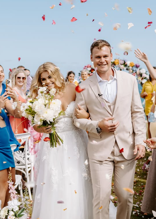 A radiant bride and groom make their grand exit surrounded by loved ones as colorful petals fill the air.