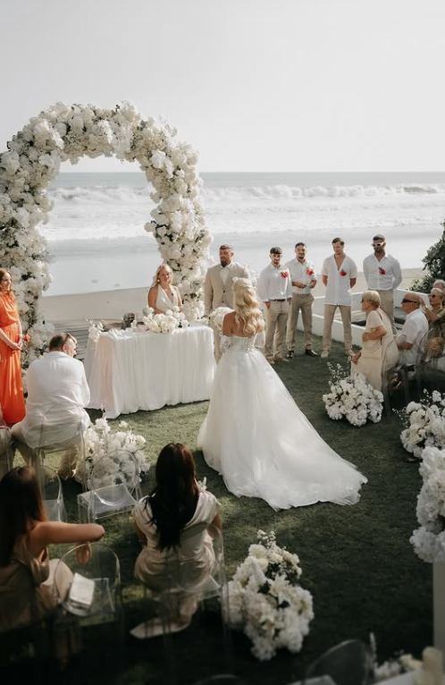 Surrounded by loved ones and serene waves, this coastal ceremony exudes elegance and romance, creating a picture-perfect moment for an unforgettable wedding day.