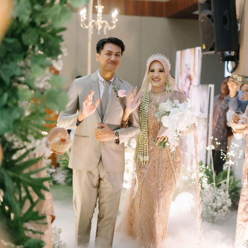 The bride’s intricately beaded gown and traditional floral hair adornments shine beautifully, while the groom’s sleek suit adds a modern balance.