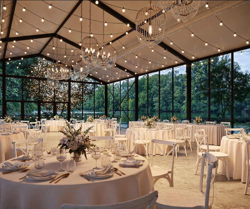 With floor-to-ceiling windows, sparkling chandeliers, and string lights that create a starry-night effect, it offers the perfect blend of elegance and romance.