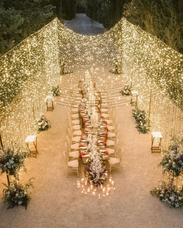 This stunning outdoor setup transforms your wedding into a fairytale with cascading fairy lights that create a dreamy tunnel of sparkle.