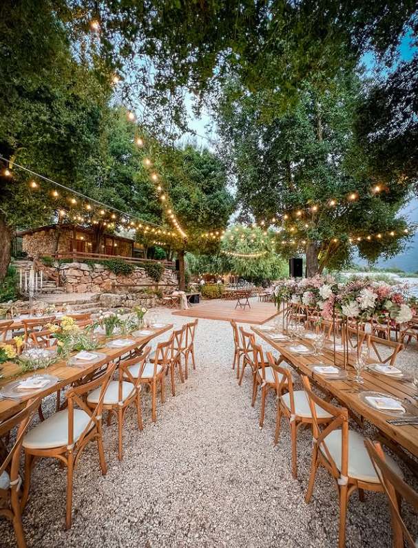 Surrounded by nature and blooming florals, it’s the perfect backdrop for a relaxed yet elegant outdoor reception under the stars.