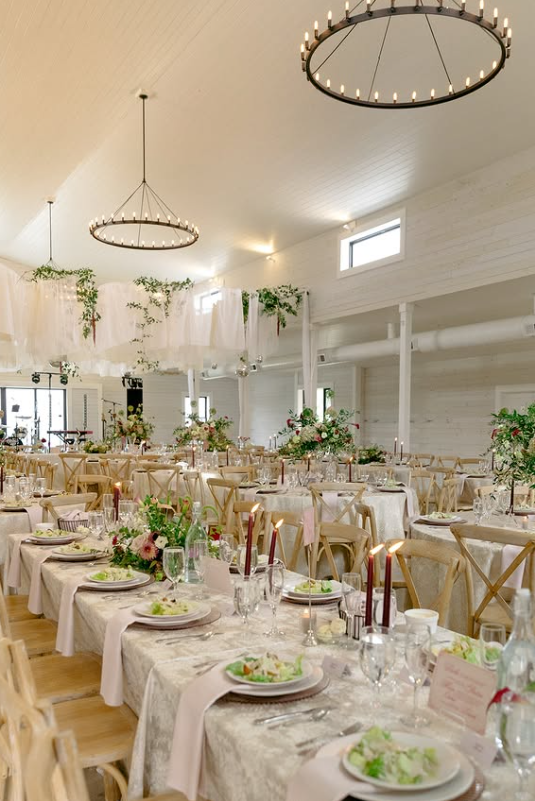 With long banquet tables dressed in soft linens and lush floral arrangements, this space is ideal for couples who want timeless beauty with a warm, cozy feel.