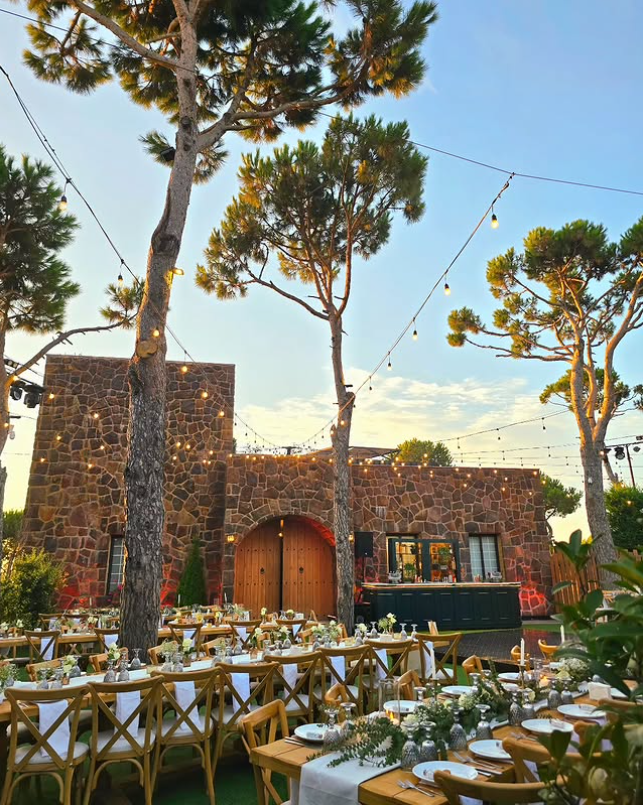 This charming courtyard wedding venue blends rustic stone architecture with romantic string lights and lush greenery.