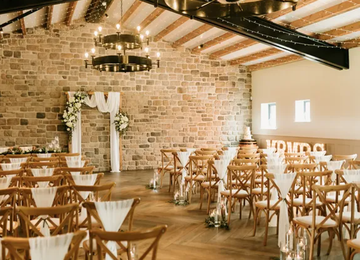 The blend of natural textures and elegant décor creates a cozy yet sophisticated atmosphere, making it a unique choice for couples seeking a countryside-inspired celebration full of charm and intimacy.
