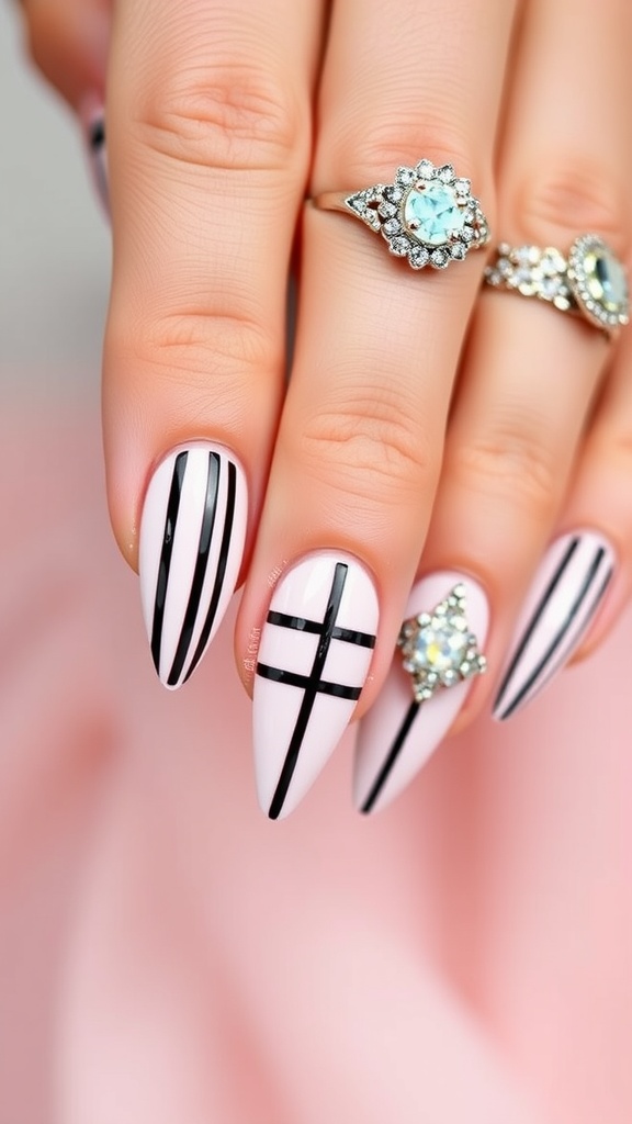 When it comes to wedding nails, simplicity can make a big statement. The image showcases a stunning minimalist design featuring sleek black stripes on a crisp white background. This look is perfect for brides who want their nails to complement their style without being overly flashy.