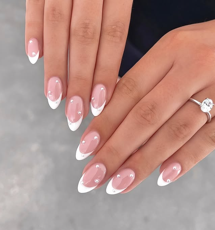 A fresh take on the classic French manicure! These white almond-shaped tips are elevated with dainty pearl-like gems and a soft pink base — simple yet stunning for the perfect bridal nail look.