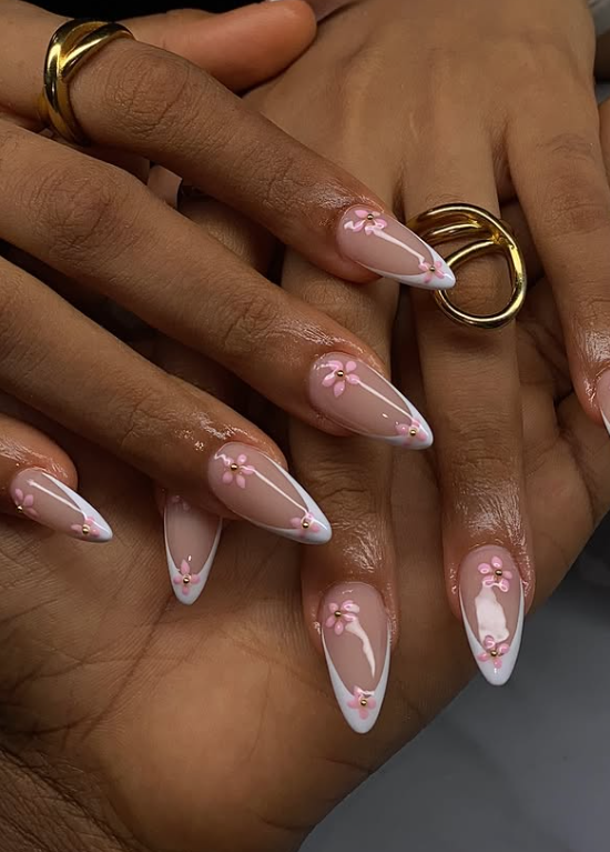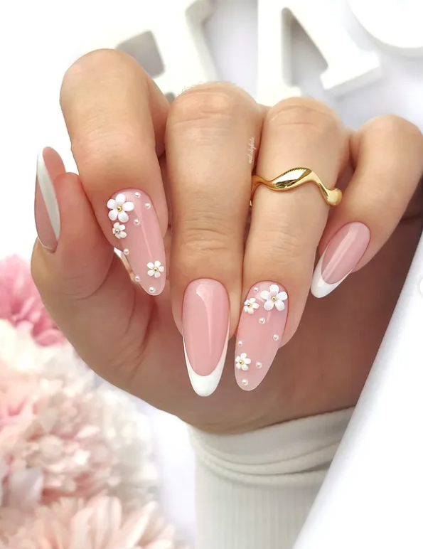 Soft pink nails with delicate French tips and tiny 3D daisies bring a fresh, romantic vibe to your big day.