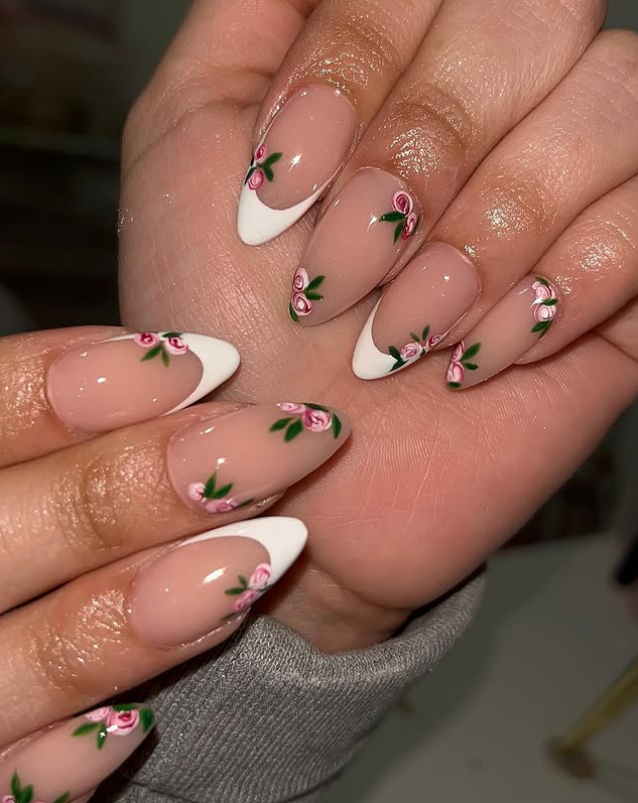 In the image, you can see beautifully manicured nails featuring a soft pink base. The tips are painted in a subtle white, forming a traditional French manicure. What makes it stand out are the lovely floral designs at the tips, which add a touch of color and charm.