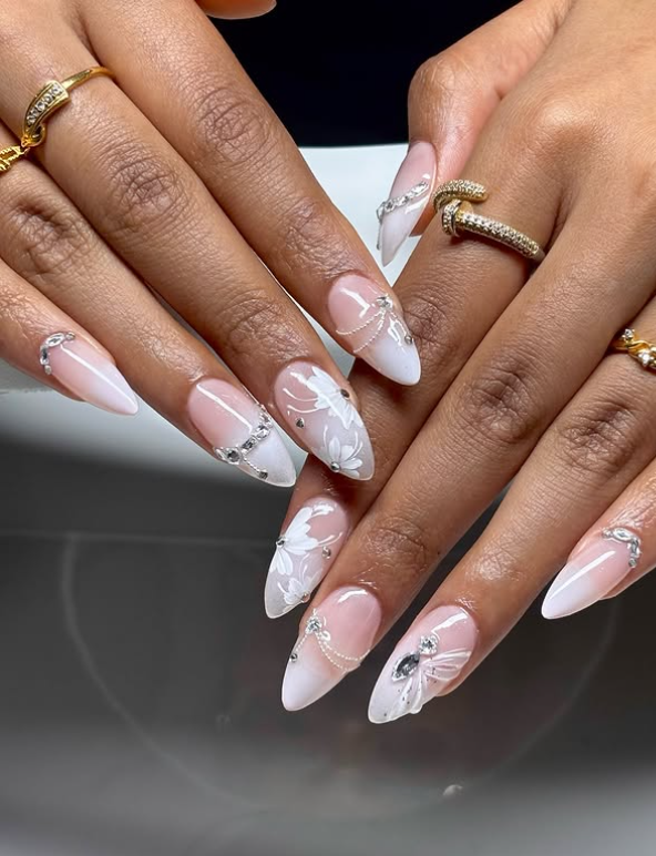 Delicate hand-painted white florals paired with soft ombré pink — this bridal nail design is pure romance.