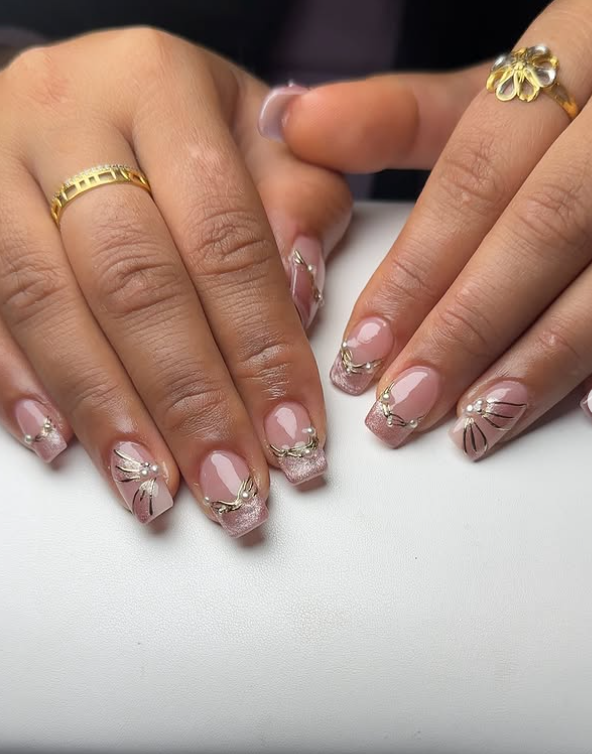 Chic and classy, these short square nails feature blush pink tips, metallic gold accents, and delicate floral detailing—perfect for brides who want an understated but luxurious wedding nail look.