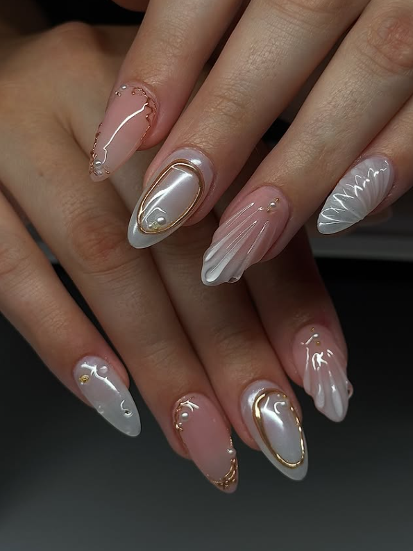 This stunning bridal nail set combines pearly white finishes, sculpted 3D art, and metallic gold detailing for a modern fairytale look.