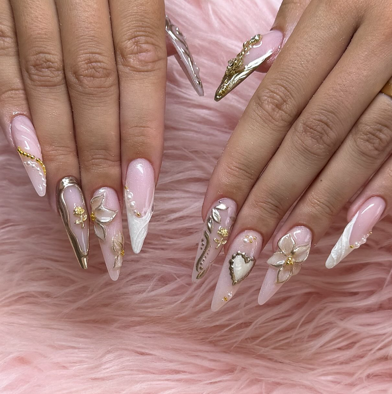 Elegant 3D Wedding Nails with Gold & Floral Touches