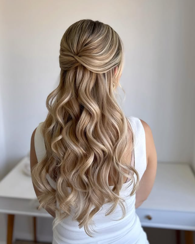 6. Elegant Half Up Half Down Curls with a Soft Twisted Crown