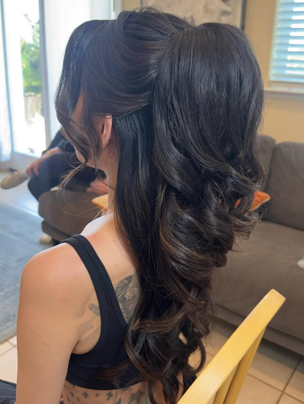 4. Glam Half Up Half Down Curls with a Soft Ponytail Twist