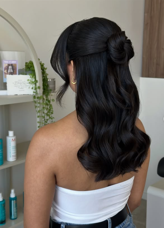 3. Chic Half Up Half Down Curls with a Sleek Twisted Bun Detail