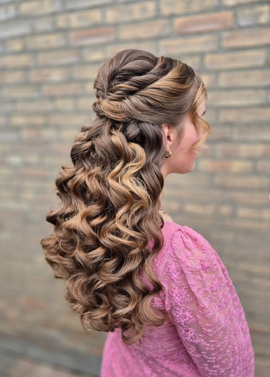 This half up half down curly hairstyle brings a soft glam feel with its lifted ponytail-style twist and voluminous curls.