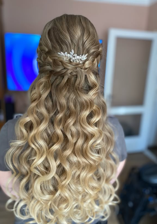 The braided detail adds depth and interest, while the defined curls create a full, bouncy finish that feels both playful and romantic.