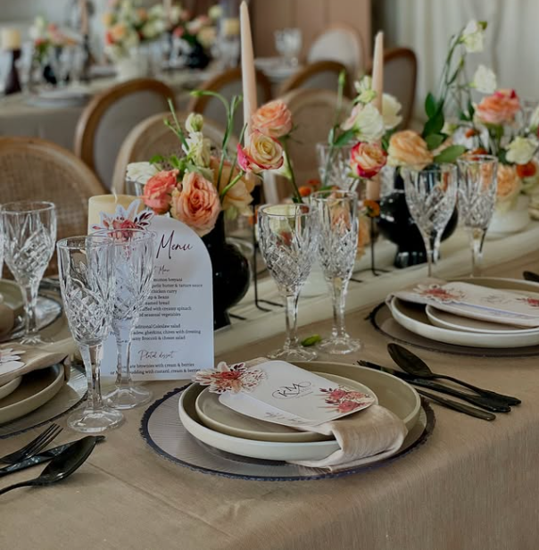 This budget-friendly rustic wedding tablescape combines soft beige linens, crystal glassware, and blush-toned florals for a dreamy yet down-to-earth reception vibe.