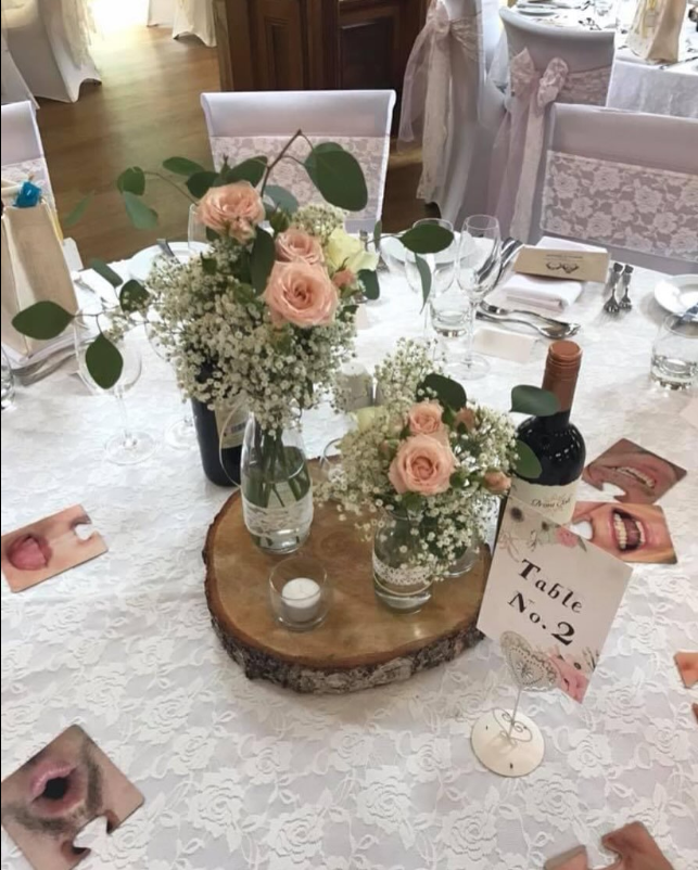 This DIY wedding table decor features a lace tablecloth, soft blush roses, baby’s breath, and recycled glass jars—all styled atop a wooden slab for that perfect rustic elegance.