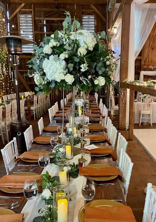 This stunning long-table setup blends rustic charm with elevated elegance—featuring a towering floral centerpiece of white roses and eucalyptus, warm wooden textures, and soft candlelight.