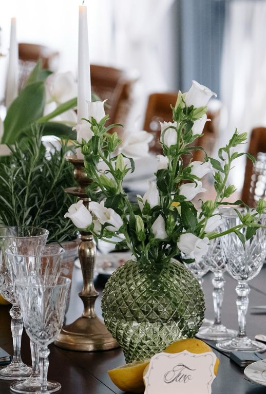 A textured green glass vase filled with fresh white florals, paired with elegant taper candles and crystal glassware, creates a rustic yet refined look—perfect for budget-conscious brides who love classic style!