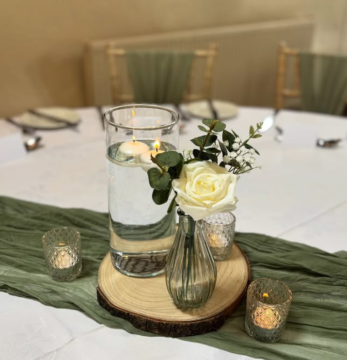 A single white rose in a textured glass vase, paired with a floating candle in a cylinder vase and warm votives, all set on a wooden slice—perfect for an intimate wedding table setup that feels cozy and refined.