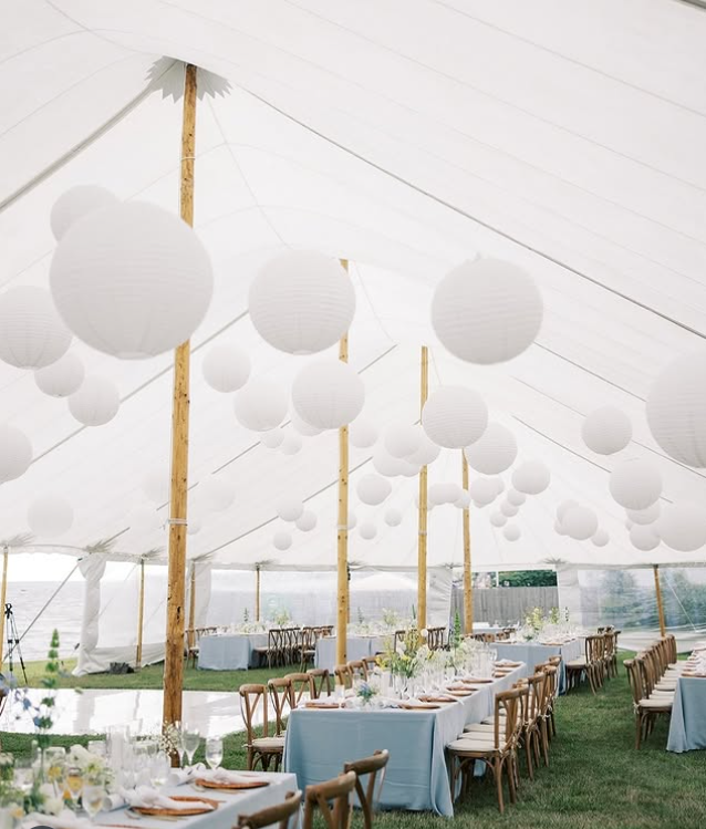 This stunning backyard tent setup brings chic simplicity to life with rows of white lanterns and soft pastel table settings.