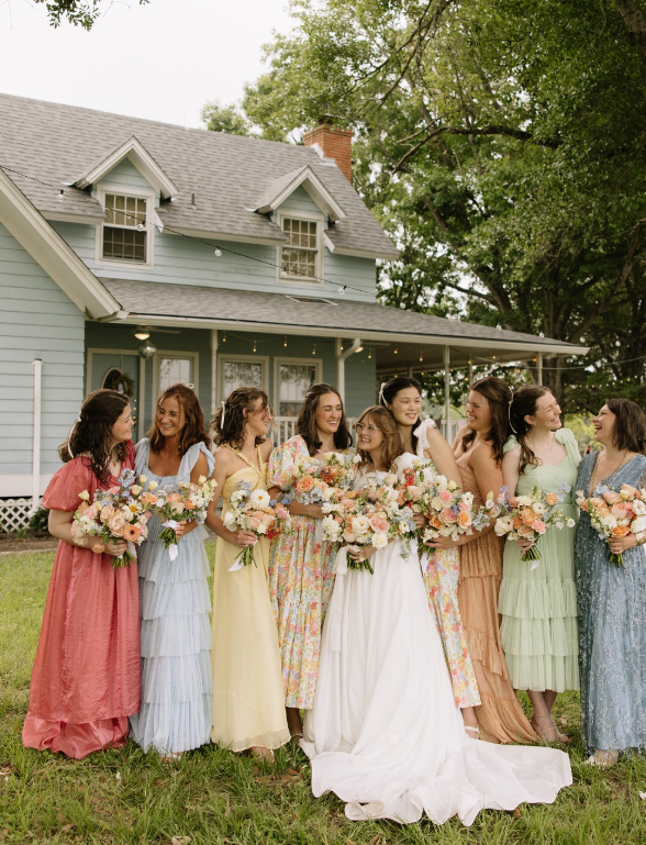 The mismatched bridesmaid dresses bring a playful, boho feel while keeping the day beautifully relaxed and personal.