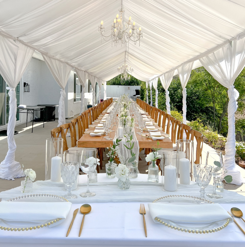 This dreamy backyard wedding setup features a stunning long banquet table beneath a white draped tent, crystal chandeliers, and minimal floral accents.
