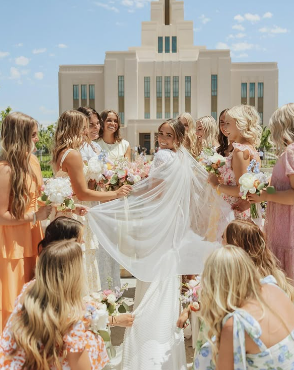 The light veil, pastel bouquets, and natural sunshine make this moment feel like pure magic.