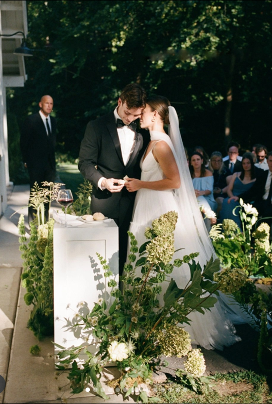 A stunning white tent adorned with lush greenery sets the stage for this graceful backyard wedding.