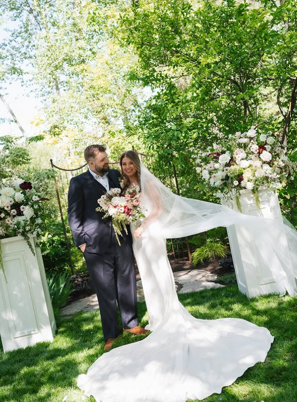 The bride’s flowing veil and timeless dress perfectly complement the outdoor garden setting, creating a fairytale moment that feels effortlessly romantic and intimate.