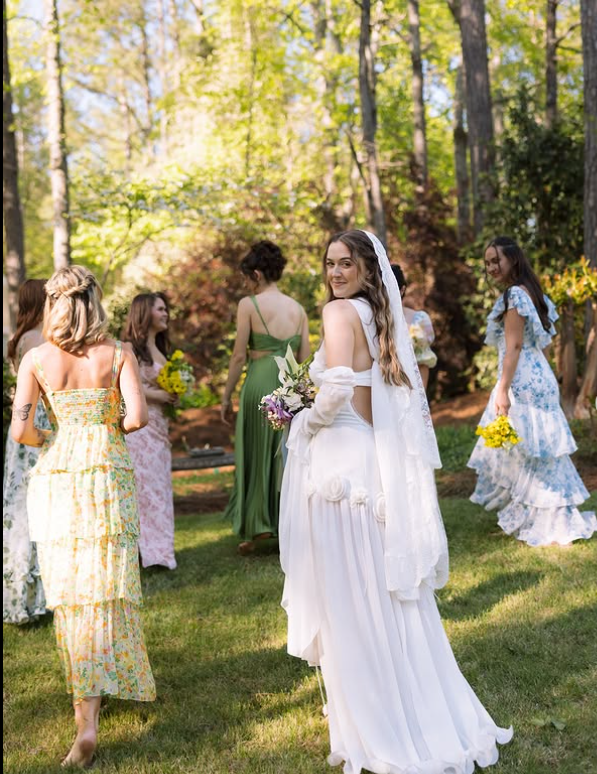 Set in a serene wooded garden, this backyard wedding captures the magic of spring with a barefoot bride and bridesmaids in flowing floral dresses.