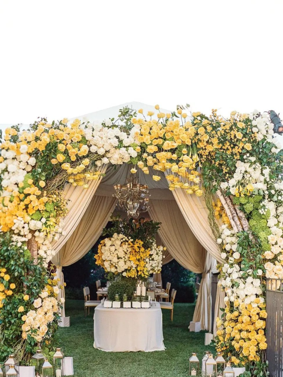 Step into a luxurious outdoor wedding tent overflowing with vibrant yellow and white blooms, romantic chandeliers, and draped fabric that frames the perfect garden celebration.