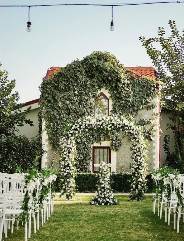 This dreamy backyard wedding setup features a stunning ivy-draped house as the backdrop, a lush floral arch, and greenery-adorned chairs lining the aisle.