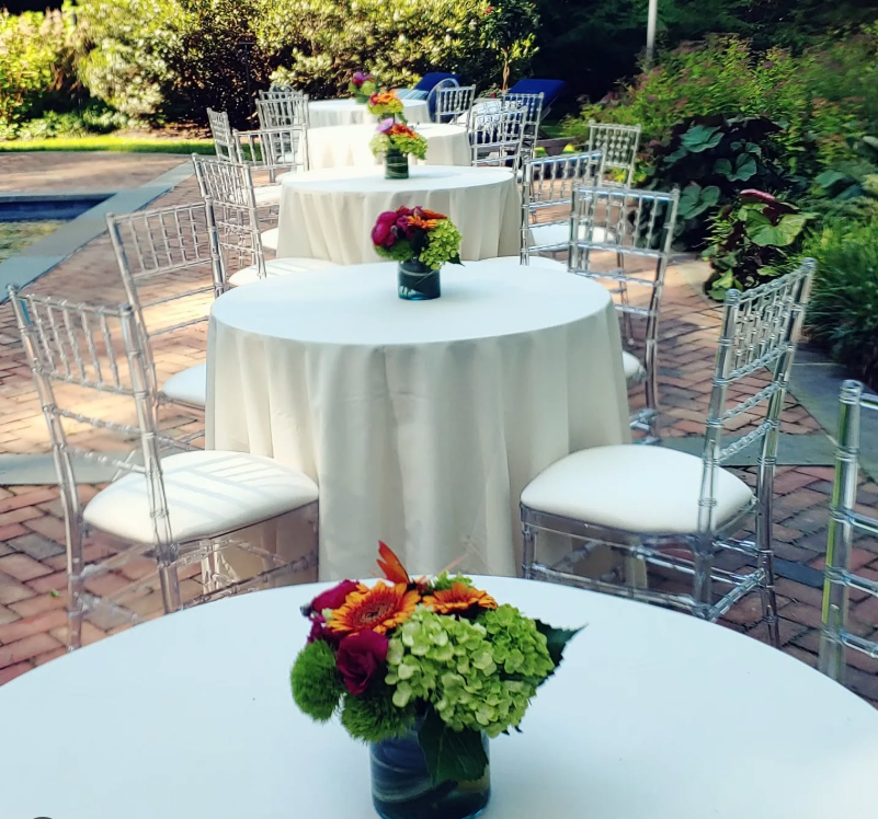 This inviting backyard setup features round white-clothed tables paired with elegant ghost chairs, offering a modern yet romantic touch.