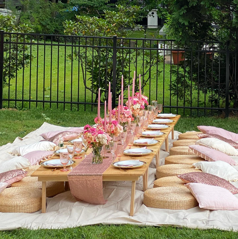 Layered floor cushions and woven mats invite guests to relax and connect, while the tall pink taper candles and sequined runner add a touch of glam.
