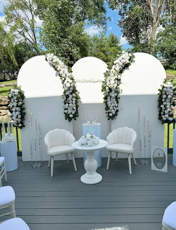 Elegant white chairs and a sculpted table sit against a custom panel backdrop, framed by cascading white rose garlands and sleek candle accents.