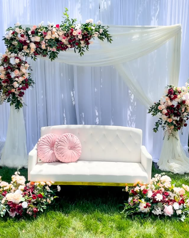 Soft draped curtains and lush floral arrangements frame a cozy loveseat, creating a romantic backyard photo spot.