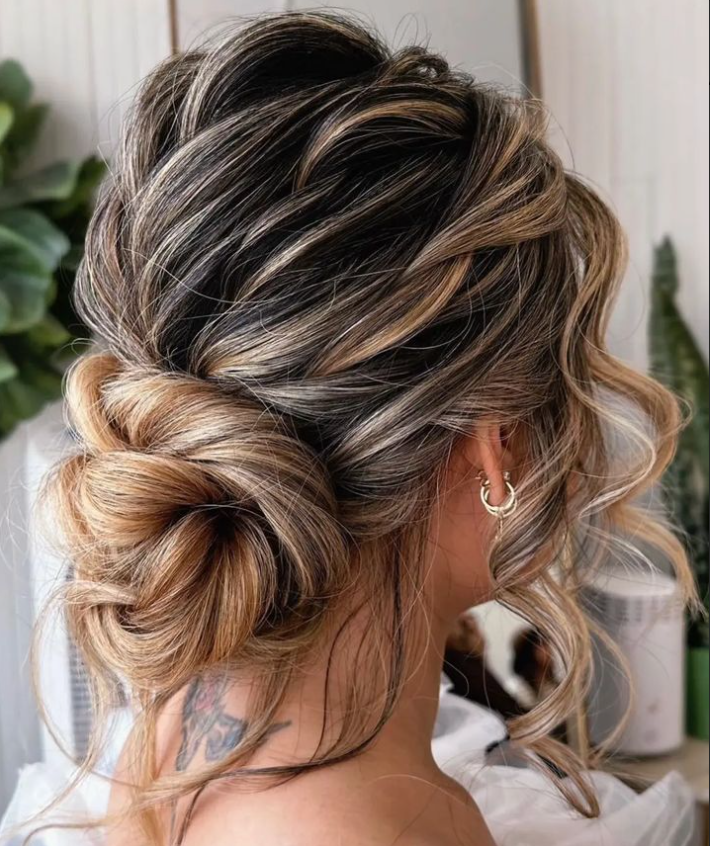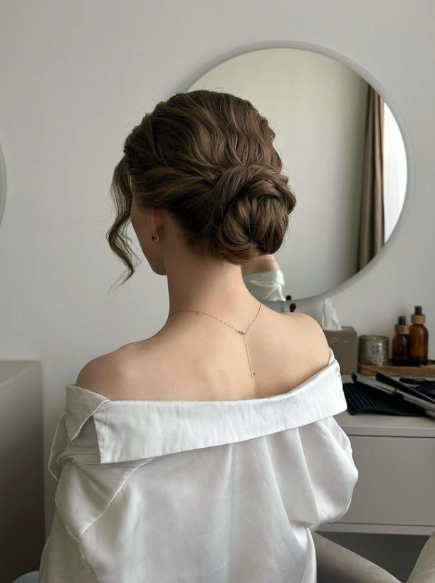 The hairstyle features a beautifully tousled and voluminous bun that sits low at the nape of the neck, creating a soft and sophisticated silhouette. Loose strands frame the face, adding a touch of romance and movement.