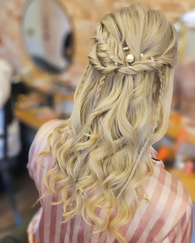The braids are complemented by soft, cascading curls that flow down the back, adding texture and movement. The addition of pearls interwoven into the braids enhances the overall sophistication and charm