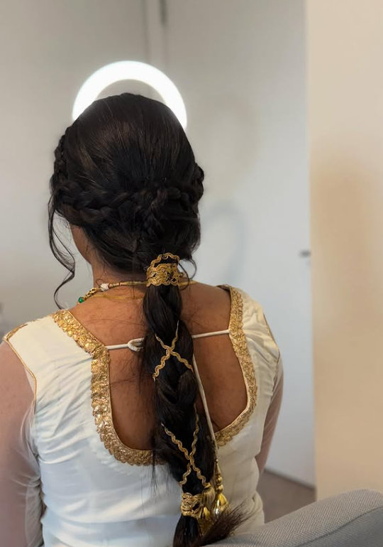 The remaining hair is left soft and natural, creating a perfect balance between intricate detail and effortless movement.