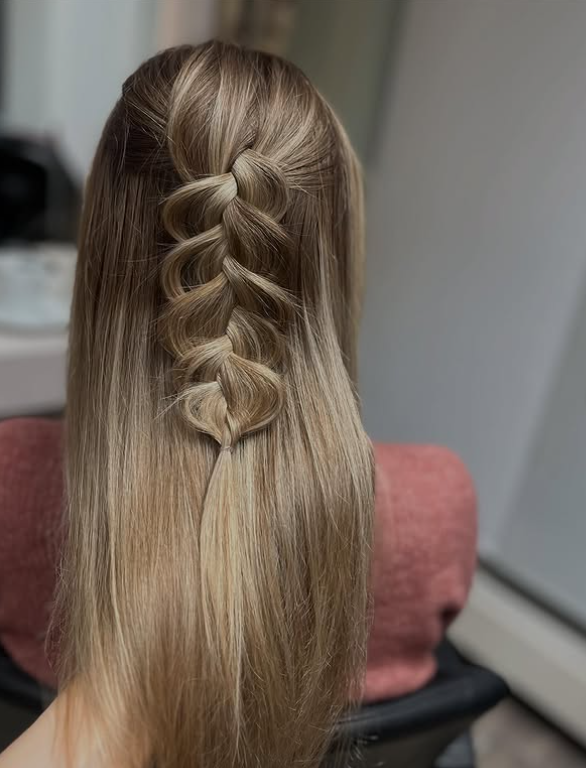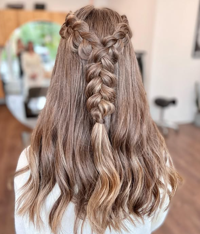 The contrast between the structured braid and loose texture creates a look that feels both stylish and effortless.