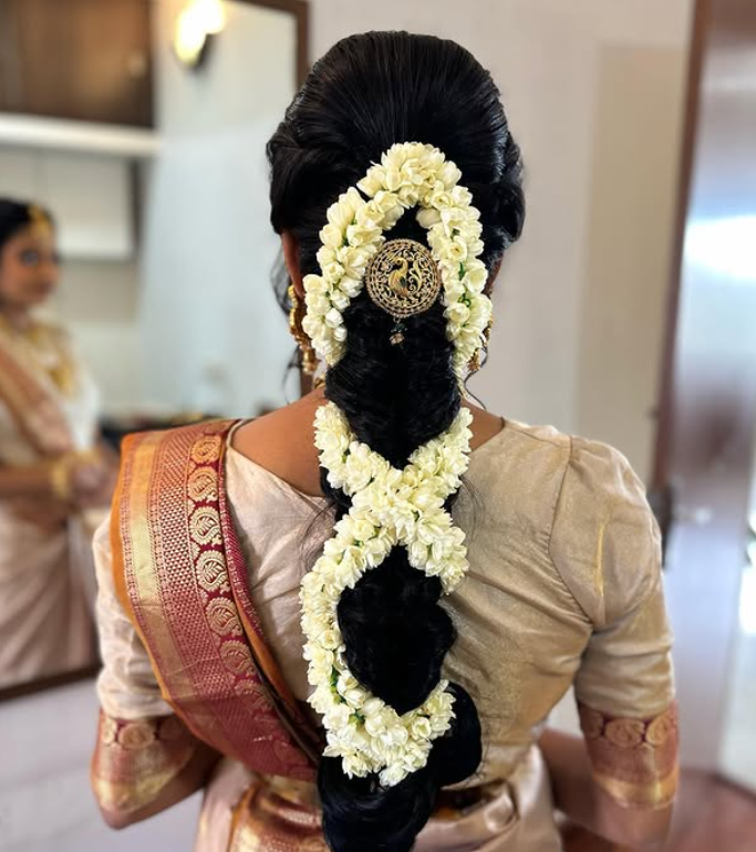 This braided bridesmaid hairstyle features a sleek, structured braid adorned with fresh floral garlands and a statement gold hairpiece for a truly regal finish.