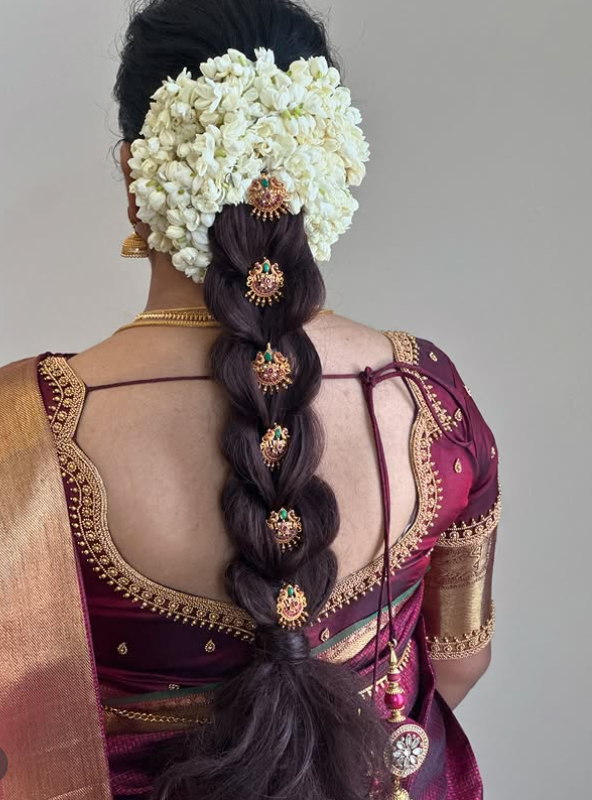 13. Traditional Floral Braid with Elegant Gold Hairpiece